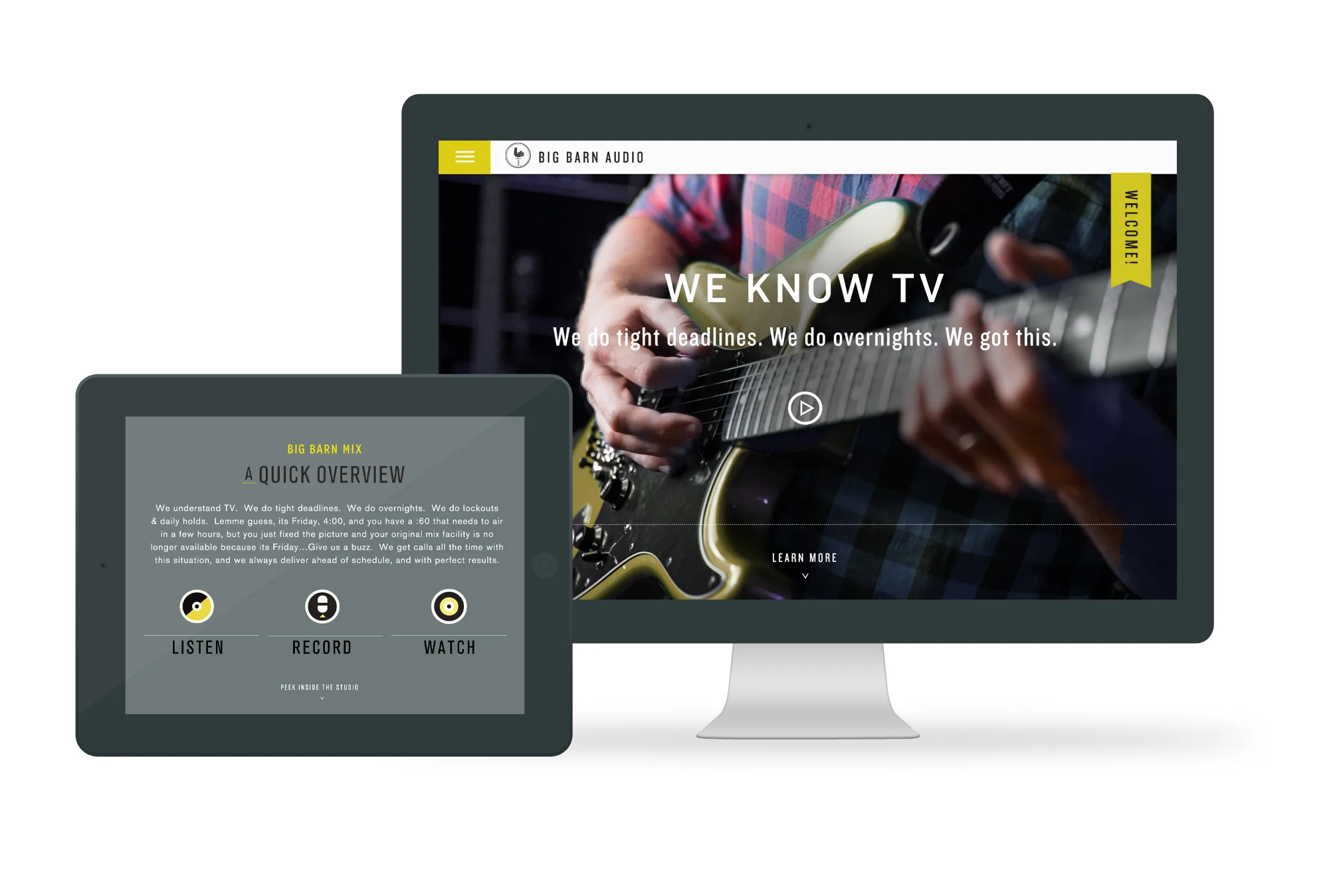 Big Barn Audio Production is a sound effects & post production audio house focusing on TV commercials and promos. They needed an identity refresh that would keep the brand true to its family-owned roots while being relevant and sophisticated enough to appeal to big budget clients such as the Cooking Channel, Food Network, A&E, TBS, and IFC. Once the new look and feel was established, I also worked up some new digital concepts for the brand's expanding web presence.