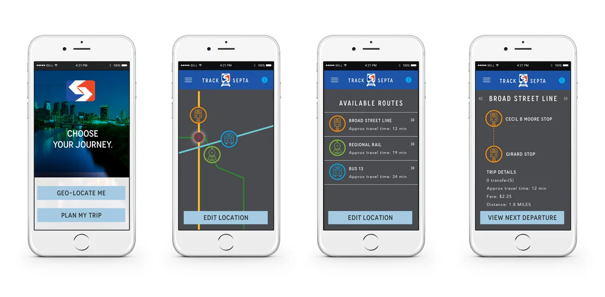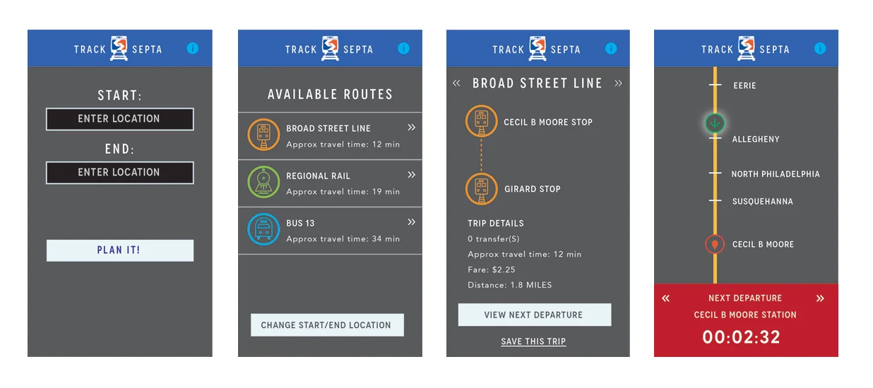 Here, users are able to plan their trip with the app. Users enter the start and end location of their trip. An autocomplete feature represents a significant upgrade over current SEPTA digital services. Then, available routes are provided. The user can choose which route to travel based on their own preferences (location, time, service type). Then, details are provided about transfers, fare, and travel time. Users can see the next departure with a map of the route provided.