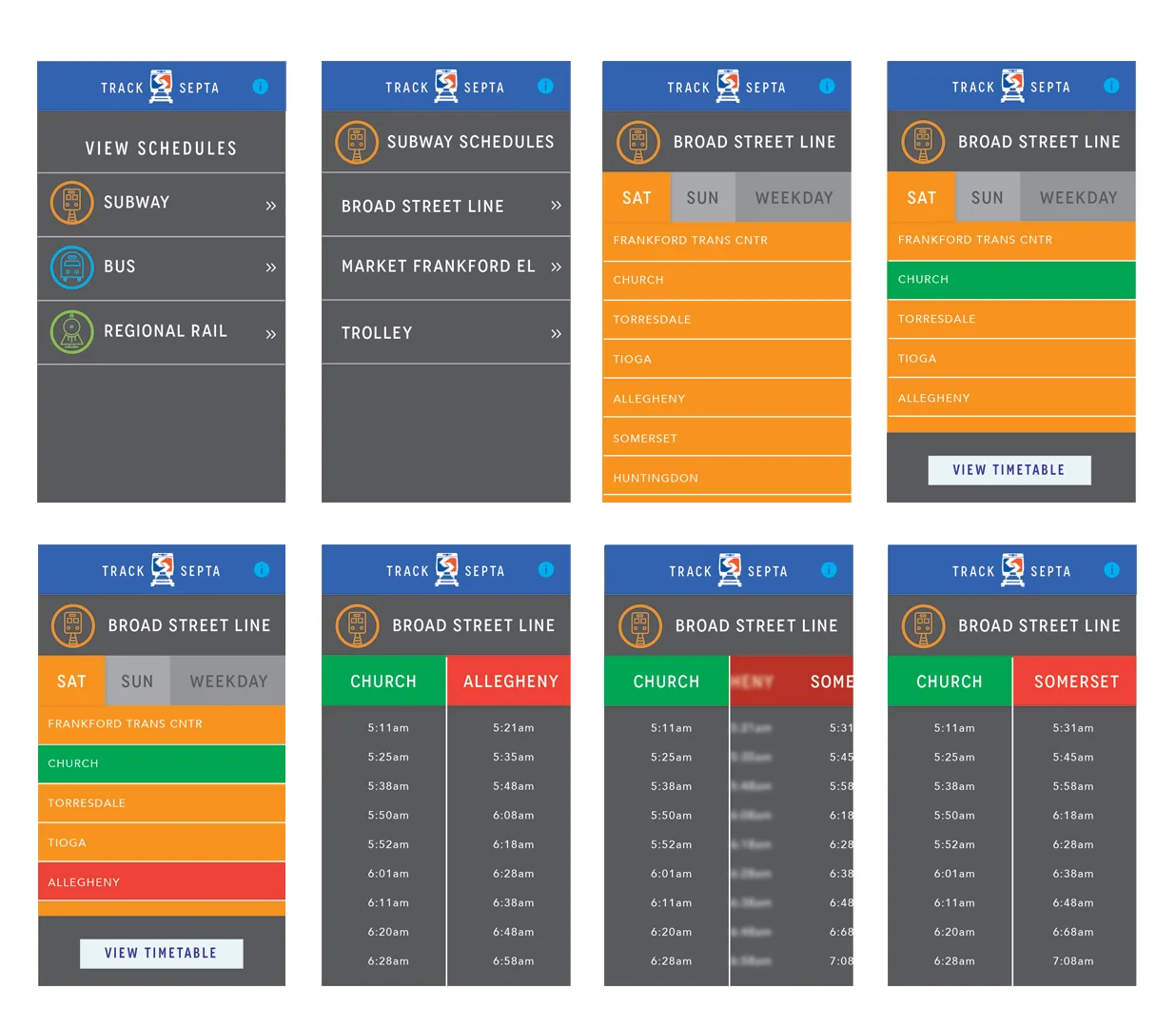 This capability allows users to see schedules for various SEPTA services. The user chooses which service they want to see, in this example the subway. Then, they choose their preferred start and end locations. This feature responds to the challenge that traditional horizontally oriented timetables presents to a mobile device.